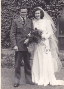 In December 1944 at a social gathering in an air hanger, mom met a Canadian airman. On Valentine’s Day 1945 my dad, Ernie Little, proposed to mom and gave her a ring that was bought at Birk’s in Calgary and sent to dad by his sister Mary. Mom had no experience with men, she went from an isolated Irish Catholic home to the air force where she lived under military control. At the age of 18, mom married in June 1945 for which dad was granted leave for only a few days, which included a few days honeymoon in Scarborough. Then dad returned as part of the invasion force working through Holland, Belgium and Germany. Mom returned to her hospital posting.